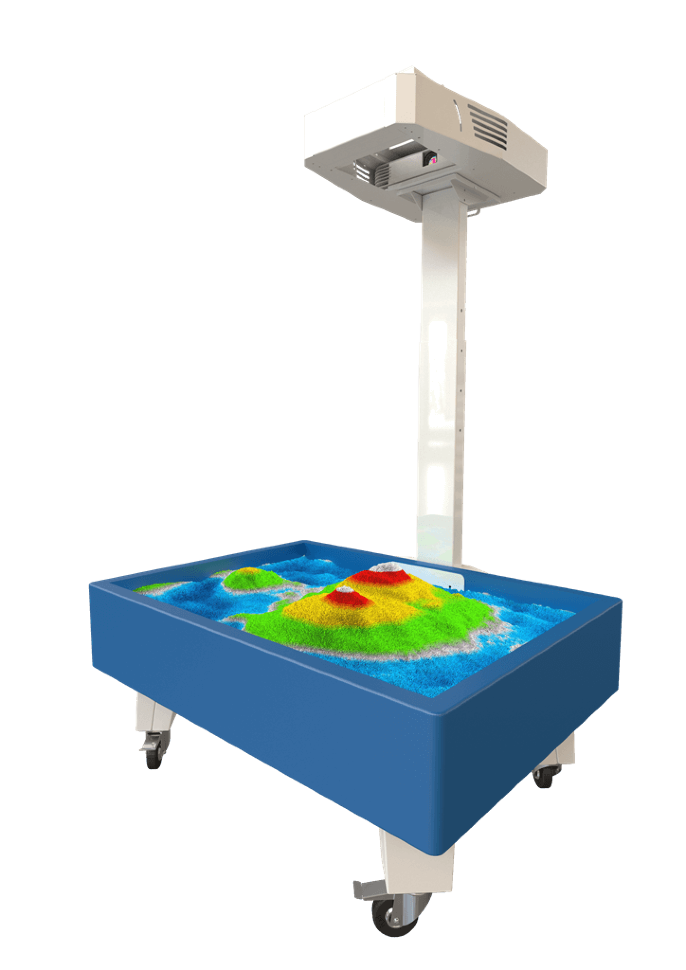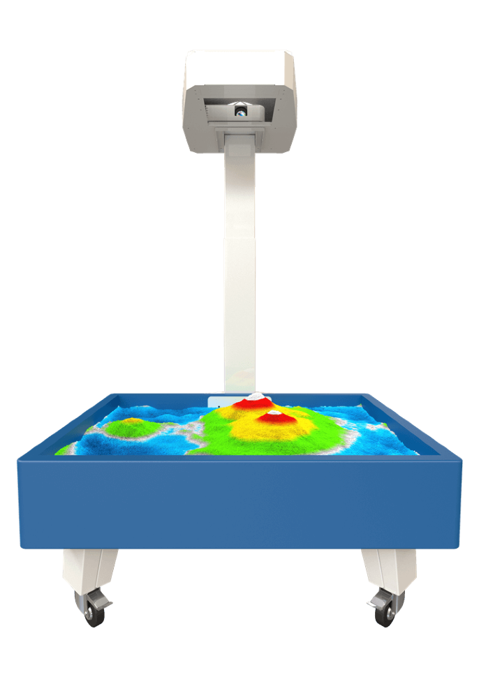 Интерактивная песочница iSandBOX Small является недорогим решением для использования в процессе обучения и сенсорных комнатах. Устройство включает в себя проектор, компьютер, датчик глубины и специально разработанное программное обеспечение, которое позволит организовать занятия в увлекательной форме. Преимуществом интерактивного ПО песочницы является способность придать обычному песку живую форму и создать уникальный рельеф построенной поверхности и в режиме реального времени управлять им. Это версия представляет из себя конструкцию со штативом, где установлены резервуар для песка, проектор, компьютер и сенсор глубины.
