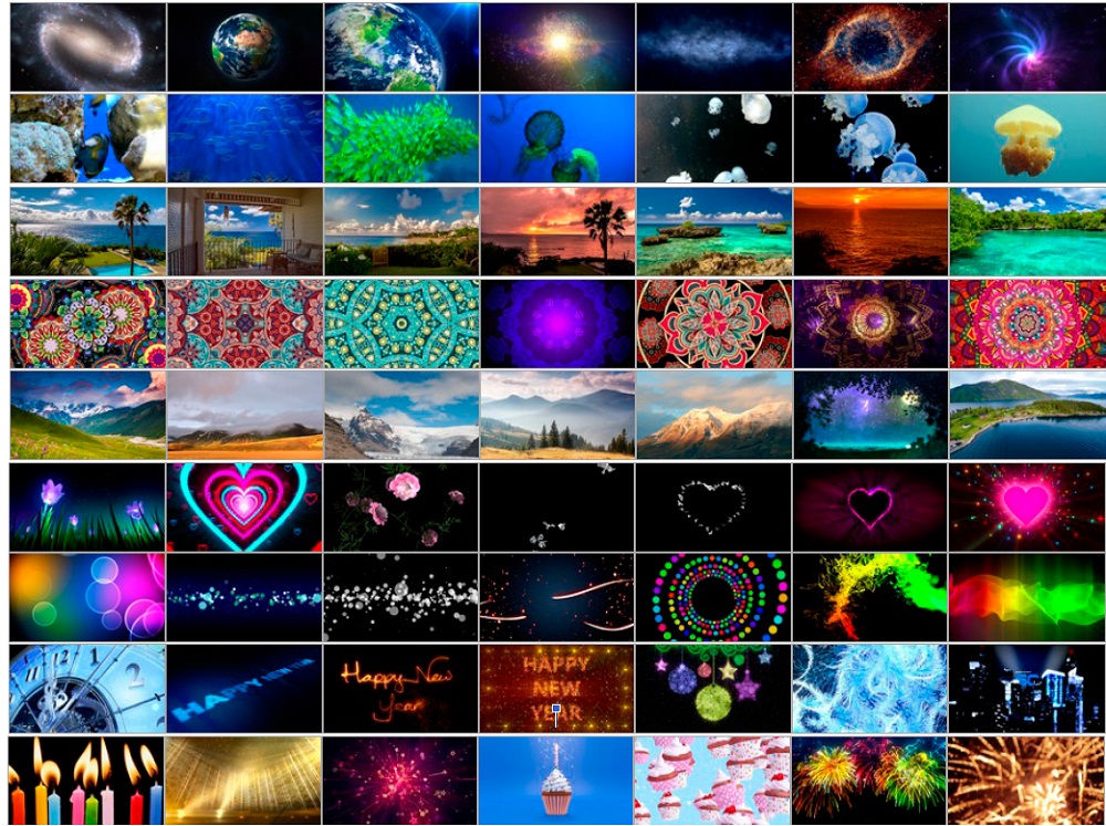 1300 ярких качественных анимационных эффектов: природа, море, подводный мир, пейзажи, животные, космос, небо, тематические эффекты на праздники, сердечки, цветы, огонь, снег, вода, салюты, абстракции, детские мультяшные анимации, а также обучающие анимации.