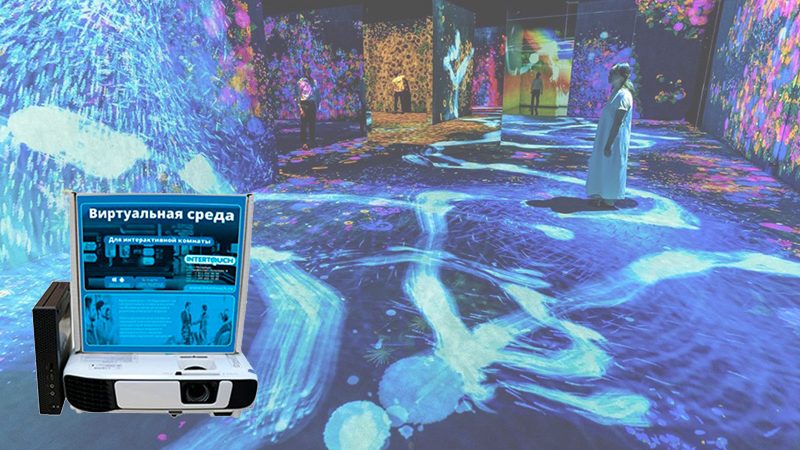 Полный комплект. Компьютер, проектор, специальное ПО InterTouch PRoom_2 для создания проекционной комнаты в любом помещении.