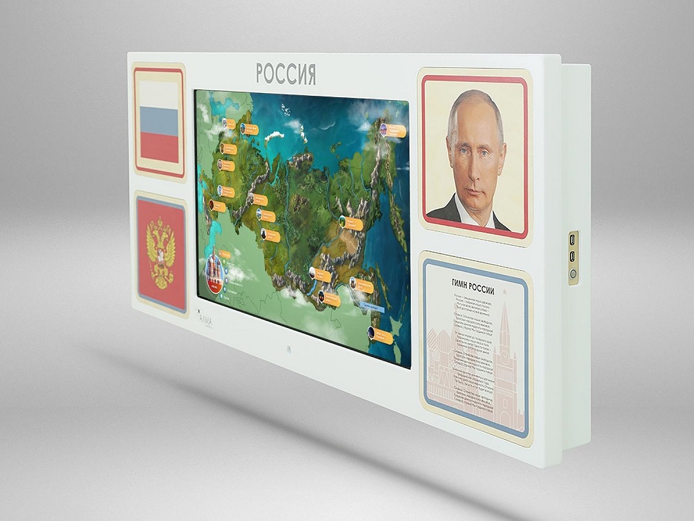 Настенная интерактивная панель АЛМА «Родина моя» с сенсорным монитором, декорированная основной символикой РФ: герб, флаг, гимн, портрет президента. Разработана для реализации программы патриотического воспитания в школе, детском саду или других образовательных учреждениях. Подходит для оформления входной зоны и классов.