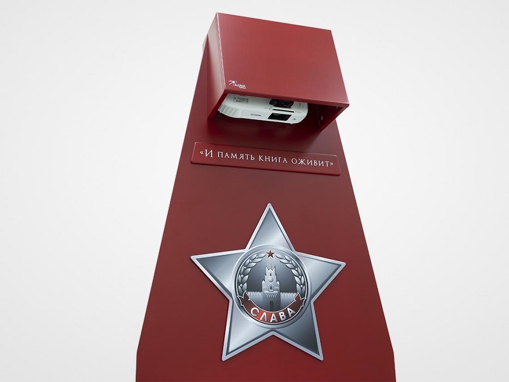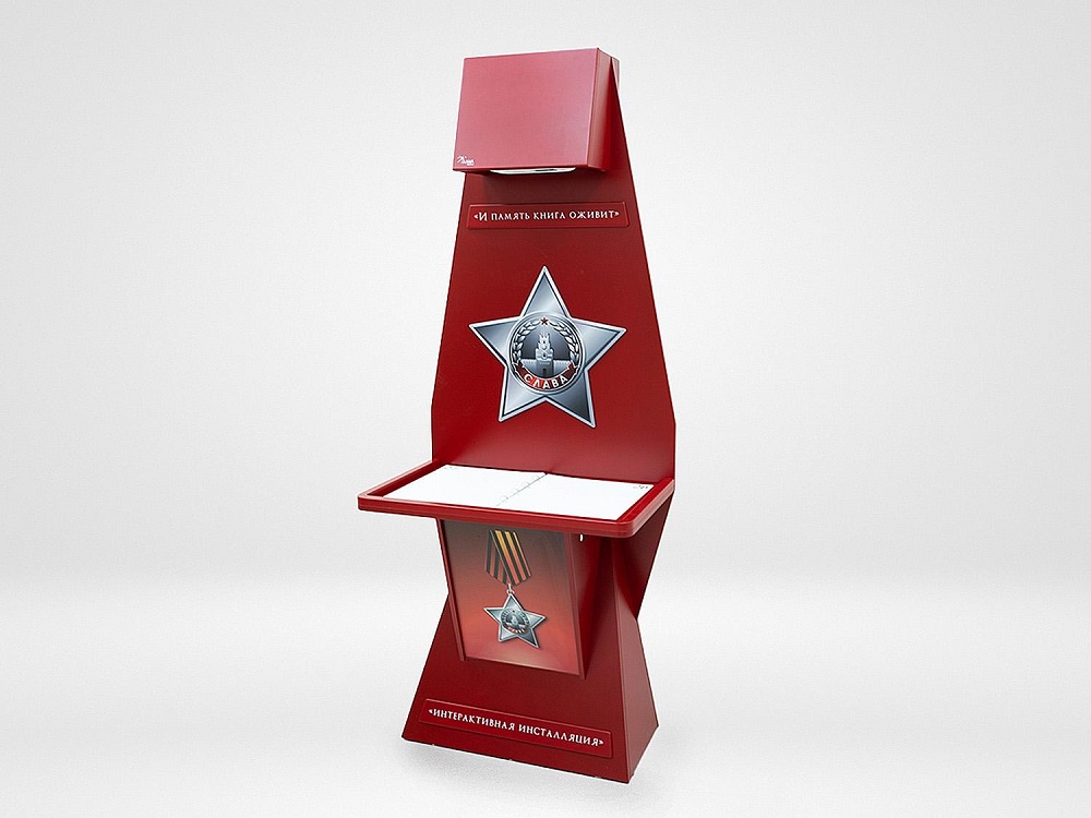 Стойка для интерактивной презентации военно-патриотического контента советской эпохи, оформленная в виде большой книги с отдельными листами, которые можно переворачивать. В верхней части стойки АЛМА «Страницы памяти» спрятан проектор, который выводит на листы изображение, при перелистывании книги информация на страницах меняется. Стойка идеально впишется в интерьер музея, библиотеки, школьного уголка патриотического воспитания.