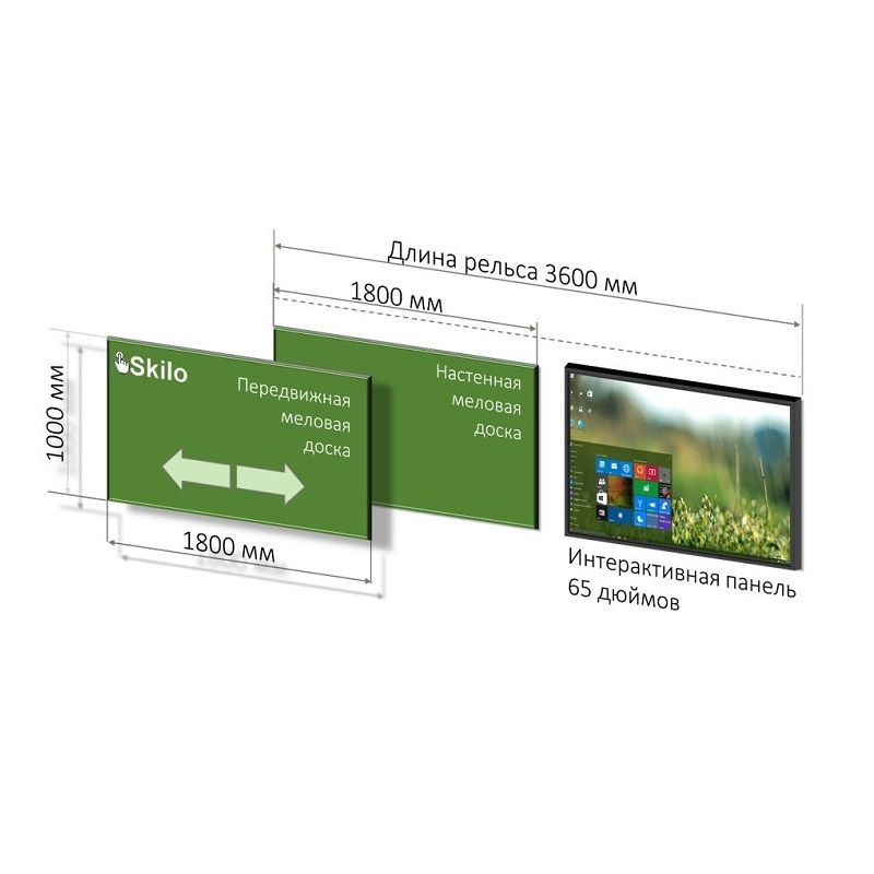 Интерактивная рельсовая система Skilo с 2-мя досками и Интерактивной панелью 65" - это компактный вариант рельсовой системы для аудиторий с ограниченной площадью. Возможна правосторонняя и левосторонняя установка интерактивного оборудования.