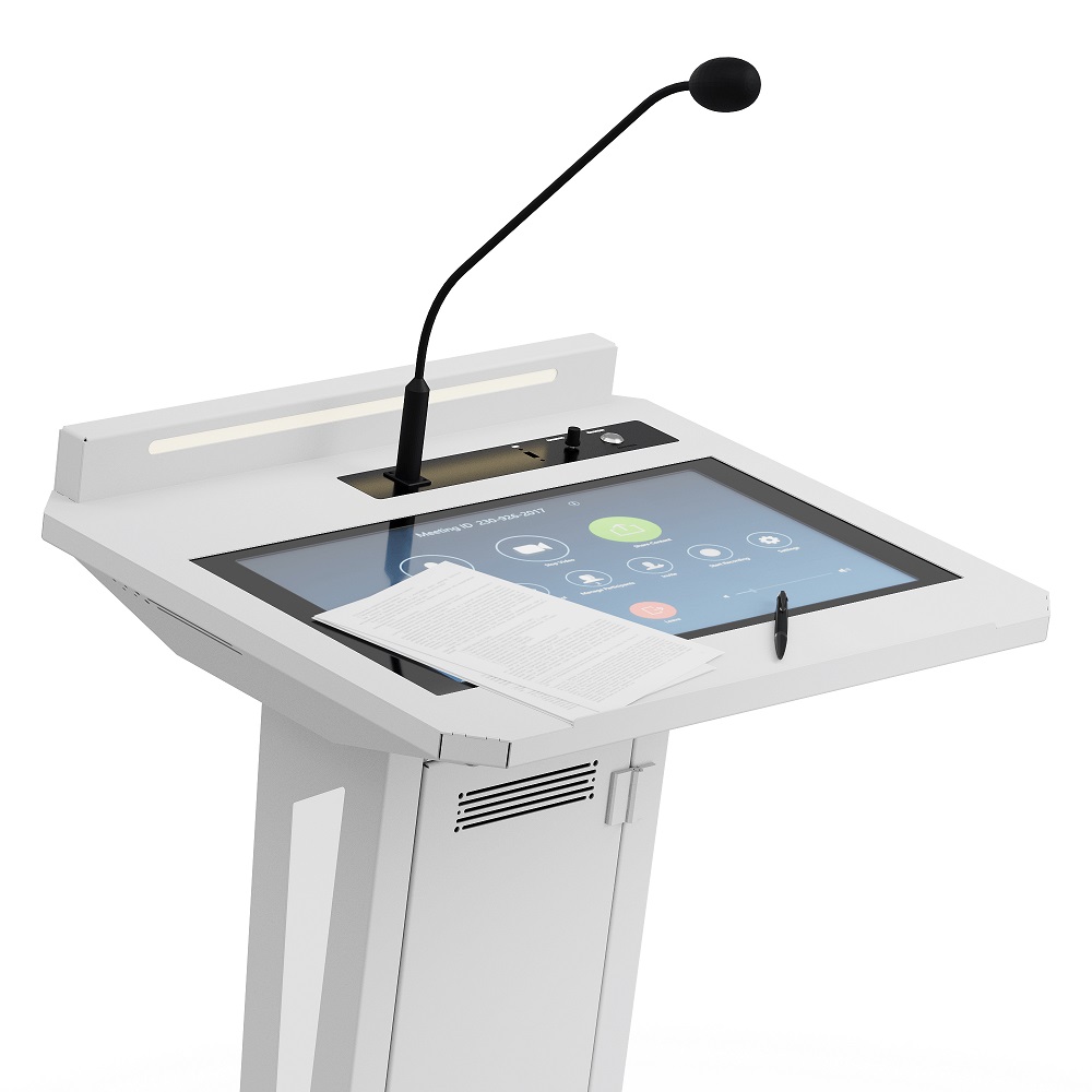Встроенные стереодинамики и микрофон на «гусиной шее» с функцией ветрозащиты и подавления шумов обеспечивают чистый и четкий звук. А мощный процессор поможет быстро воспользоваться необходимыми для выступления материалами.
