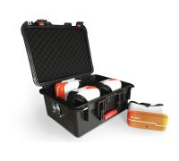 Комплект гарнитур поставляется в мобильном пластиковом кейсе, который обеспечивает не только сохранность оборудования, но и позволяет своевременно и оперативно его заряжать. Кейс оснащён колёсами и выдвижной ручкой для удобного перемещения из кабинета в кабинет.