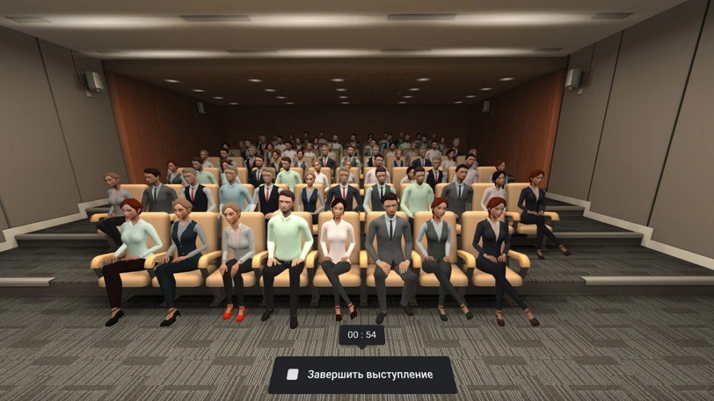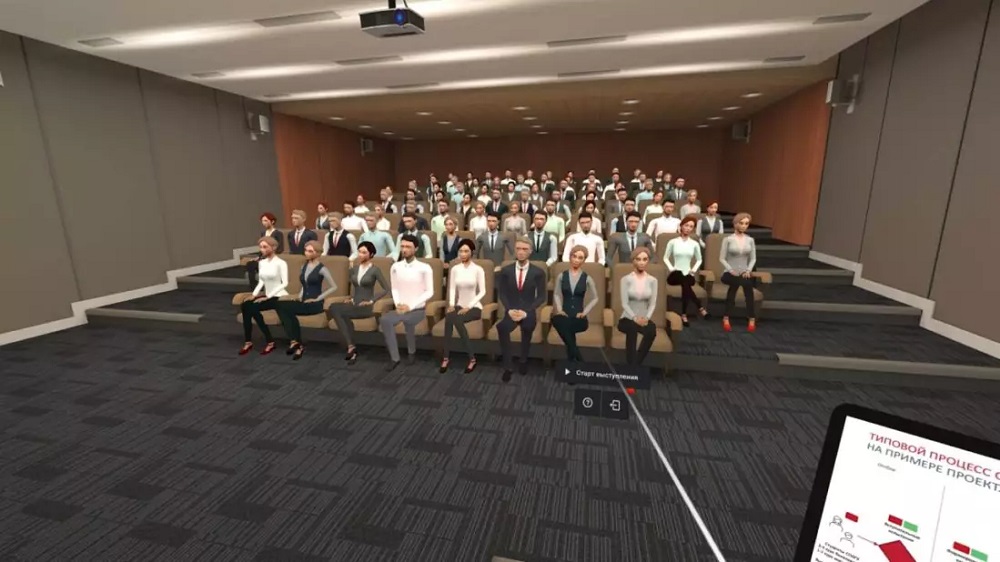 Пользователь находится на сцене зала перед аудиторией виртуальных зрителей. Он может загрузить на виртуальный экран свою презентацию и сопровождать свою речь сменой слайдов.