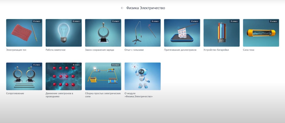 - Режим эксперимента: С конструктором простых цепей для изучения правил сборки и схематического обозначения устройств и элементов и опытами с сопротивлением проводников