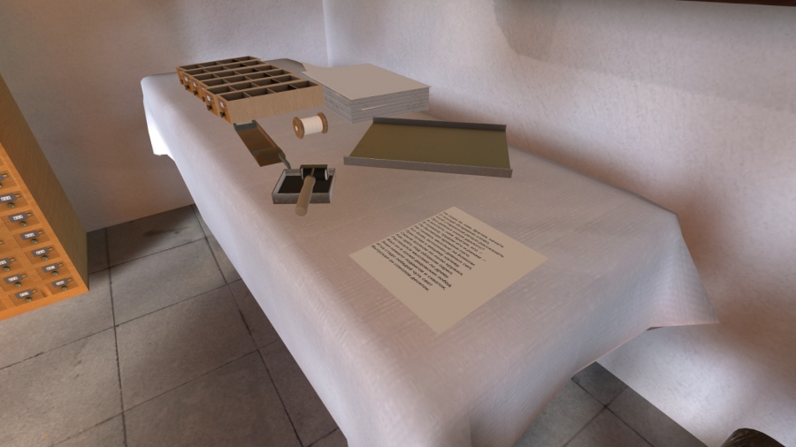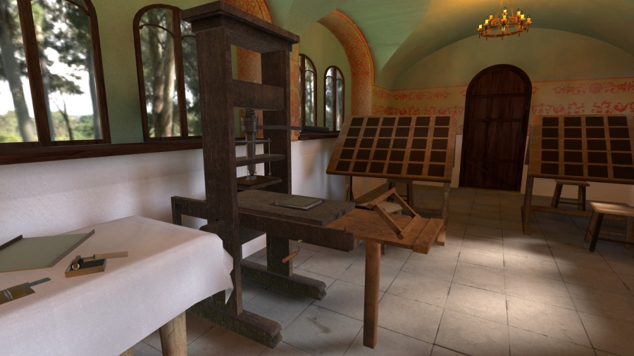 Действие происходит в Московском печатном дворе во времена правления Ивана Грозного. В симуляции тренажера"История. Книгопечатание" Modum Lab находится подлинное убранство печатного двора и множество инструментов для печати, такие как: деревянный печатный станок, набор литер, чернильница, стопки бумаги и многое другое. Пользователю предстоит погрузиться в увлекательный процесс книгопечатания и познакомиться с историей этого уникального ремесла.